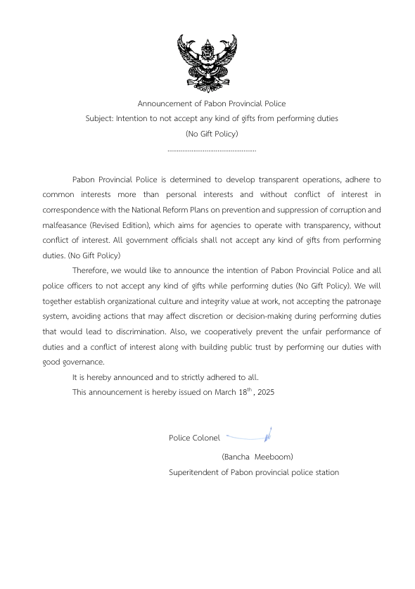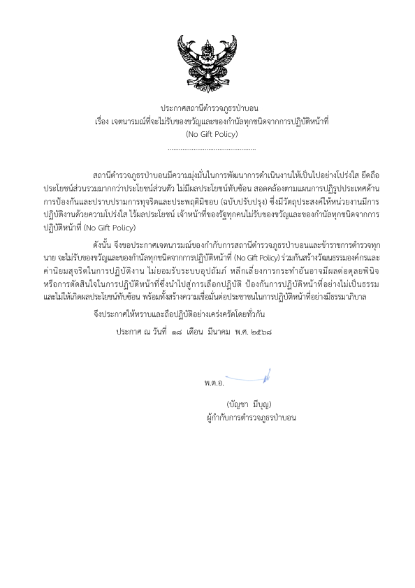 จากการปฏิบัติหน้าที่ (No Gift Policy)
